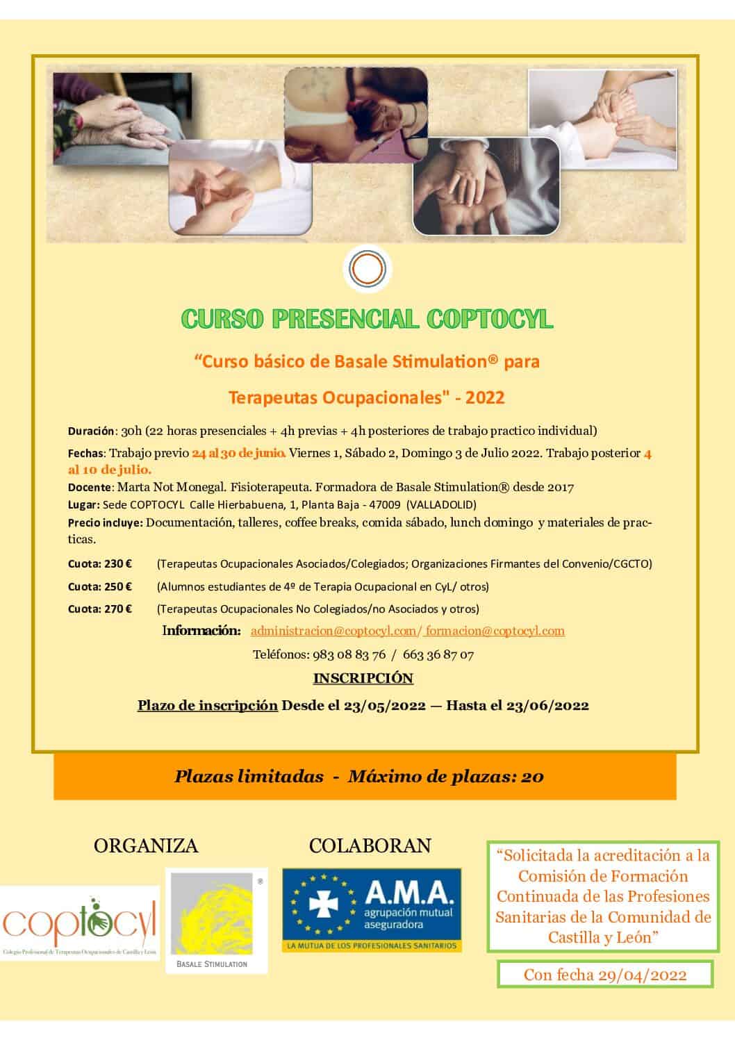 COPTOCYL Calle Hierbabuena, 1, Planta Baja, Valladolid, Valladolid, EspañaCurso Básico de Basale Stimulation® para terapeutas ocupacionales: 1, 2 y 3 de Julio del 2022 Sede COPTOCYL. Calle Hierbabuena, 1, Planta Baja - 47009 Valladolid Teléfonos: 983 08 83 76 / 663 36 87 07 Más información: formacion@coptocyl.com Docente: Marta Not Monegal Precio: Cuota: 230 € (Terapeutas Ocupacionales Asociados/Colegiados; Organizaciones Firmantes del […]